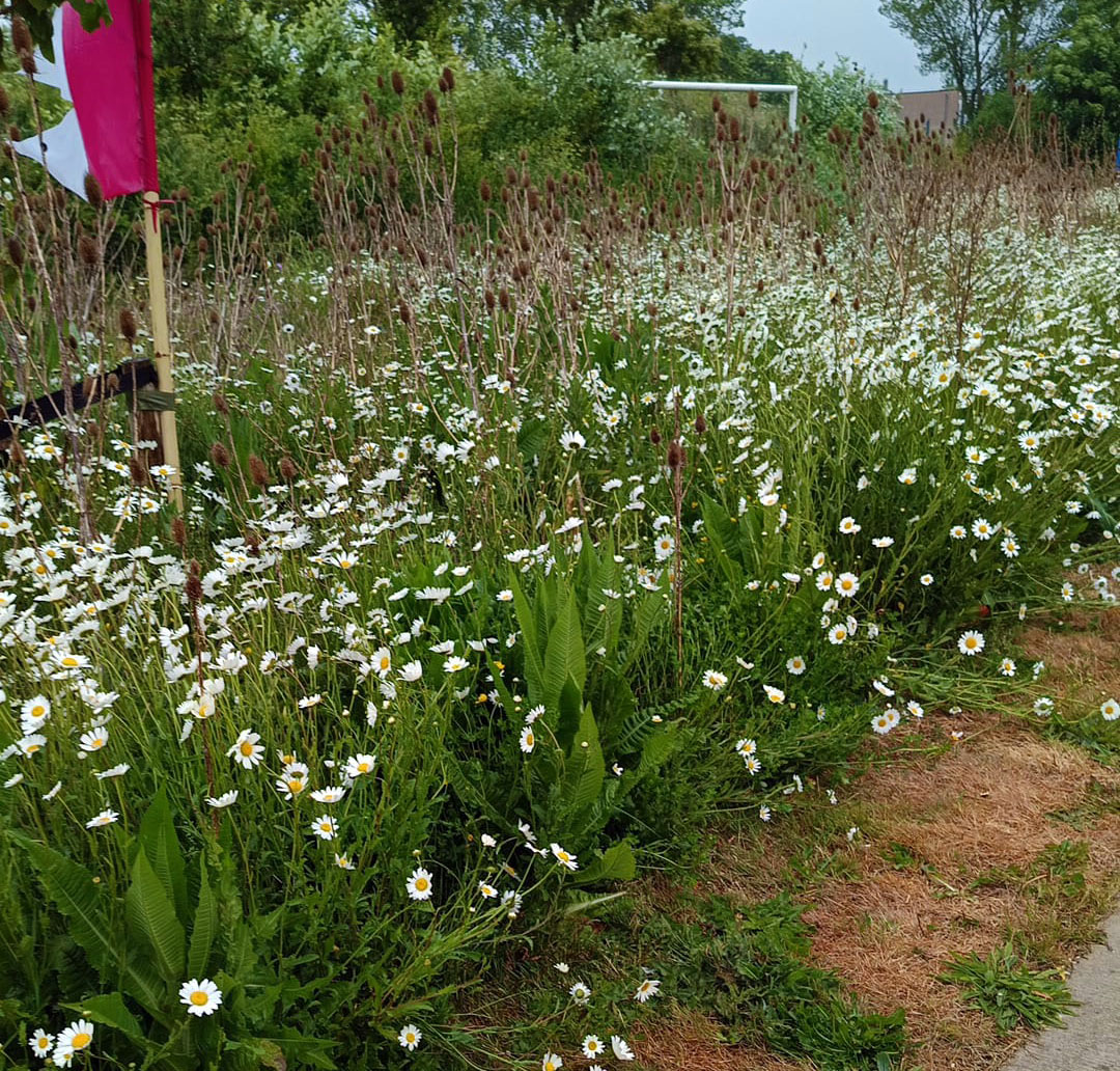 Het voormalige voetbalveld van Harlingen (de doelpalen zijn nog te zien op de achtergrond) is nu het Balklandpark en een bloemenzee. (foto: Henriette Le Roy)